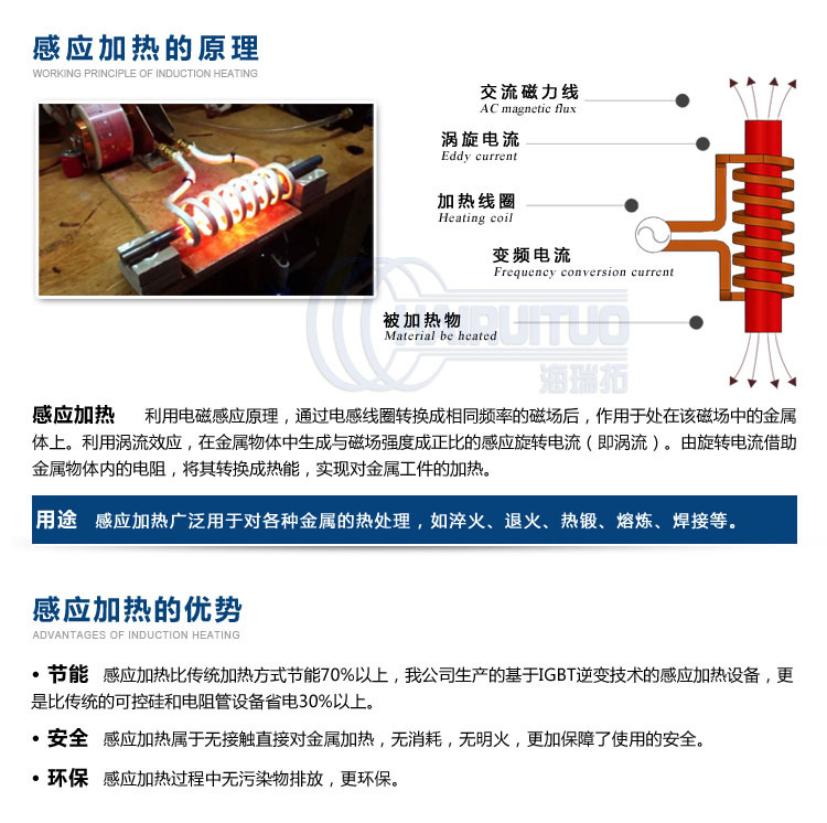 高頻大電流流向被繞制成環(huán)狀或其它形狀的加熱線圈(通常是用紫銅管制作),由此在線圈內(nèi)產(chǎn)生極性瞬間變化的強(qiáng)磁束,將金屬等被加熱物質(zhì)放置在線圈內(nèi),磁束就會貫通整個被加熱物質(zhì),在被加熱物質(zhì)內(nèi)部與加熱電流相反的方向產(chǎn)生很大的渦電流,由于被加熱物質(zhì)內(nèi)的電阻產(chǎn)生焦耳熱,使物質(zhì)自身的溫度迅速上升從而達(dá)到加熱的效果。